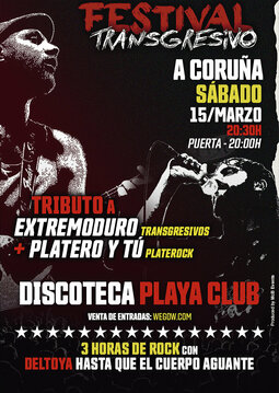 FESTIVAL TRANSGRESIVO es un formato de concierto dual formado en 2014 e interpretado por PlateRock (tributo a Platero y Tú) y Transgresivos (tributo a Extremoduro), los cuales se unen para ofrecer un espectáculo de más de 2 horas de clásicos en directo con “Deltoya Hasta que el Cuerpo aguante” y las canciones más emblemáticas del repertorio de dos de las bandas más importantes de la historia del rock nacional. Juntos emulan la Gira “Iros todos a tomar por Culo” que realizaron en el año 1997 con títulos como: Jesucristo García, So Payaso, Standby (Extremoduro) + El roce de tú cuerpo, Cigarrito, Hay poco rock’n’roll (Platero y tú) + otras composiciones de su carrera musical y discográfica.